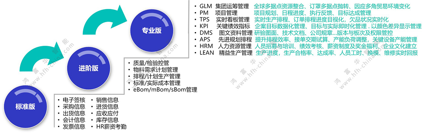 根據(jù)中小企業(yè)不同階段的發(fā)展需要,鴻富華提供可兼容擴(kuò)展的標(biāo)準(zhǔn)、進(jìn)階與專業(yè)版數(shù)字化管理系統(tǒng),實現(xiàn)系統(tǒng)的快速、低成本升級。根據(jù)企業(yè)的需要,各模塊也可在數(shù)字化管理平臺基礎(chǔ)上,獨立組合及延展為MES、WMS等高階專業(yè)軟件,原有數(shù)據(jù)可實現(xiàn)快速的共享與導(dǎo)入/導(dǎo)出。鴻富華中小企業(yè)數(shù)字化管理平臺,既滿足企業(yè)發(fā)展初期的需要,也能兼顧企業(yè)發(fā)展中后期的升級需求。