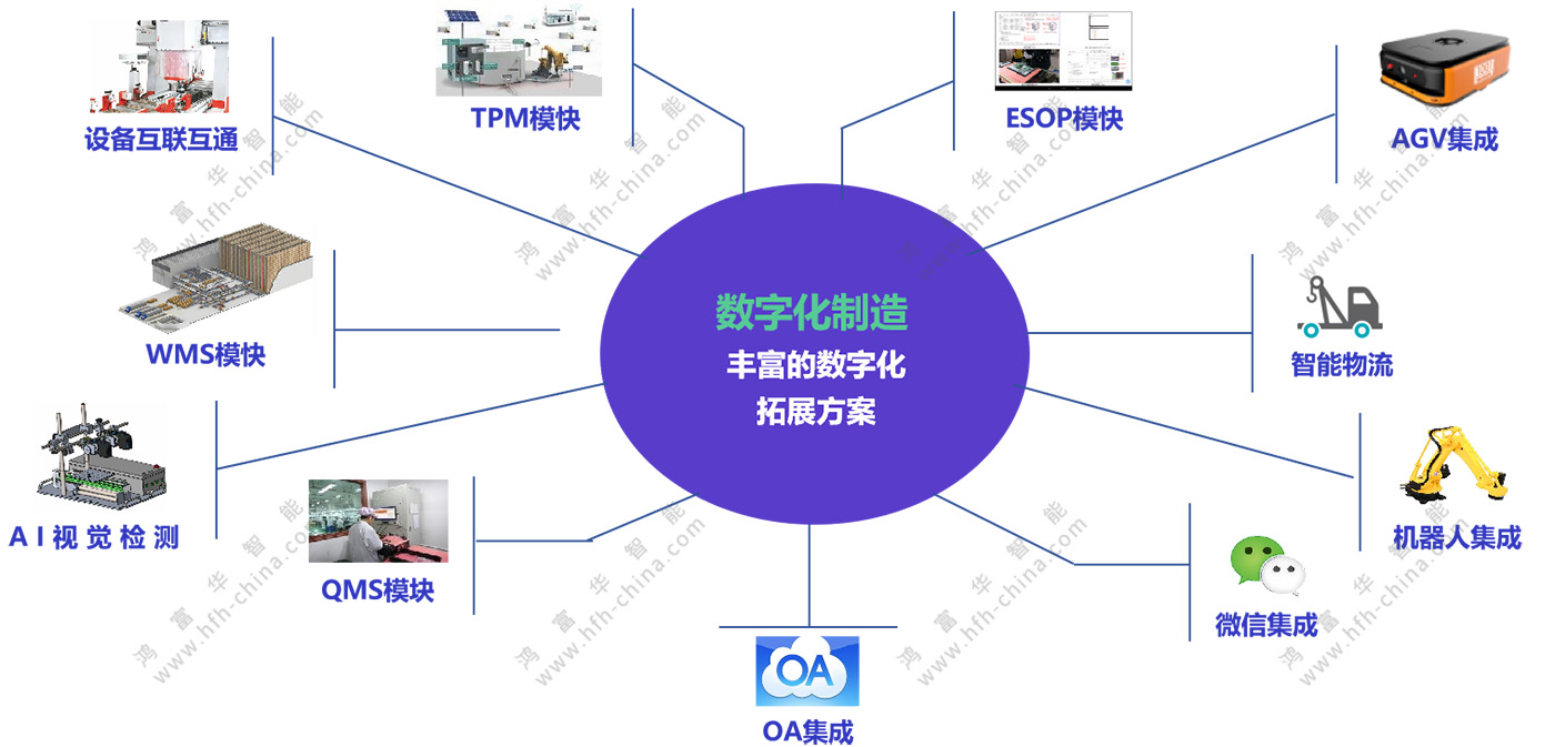 鴻富華自有的MES系統,提供包括生產數據管理、計劃排產管理、生產調度管理、產品追溯、庫存管理、質量管理、設備管理、看板管理、生產過程控制等管理功能,為企業打造一個穩定、可靠、先進、可擴展的智能制造協同管理平臺。
