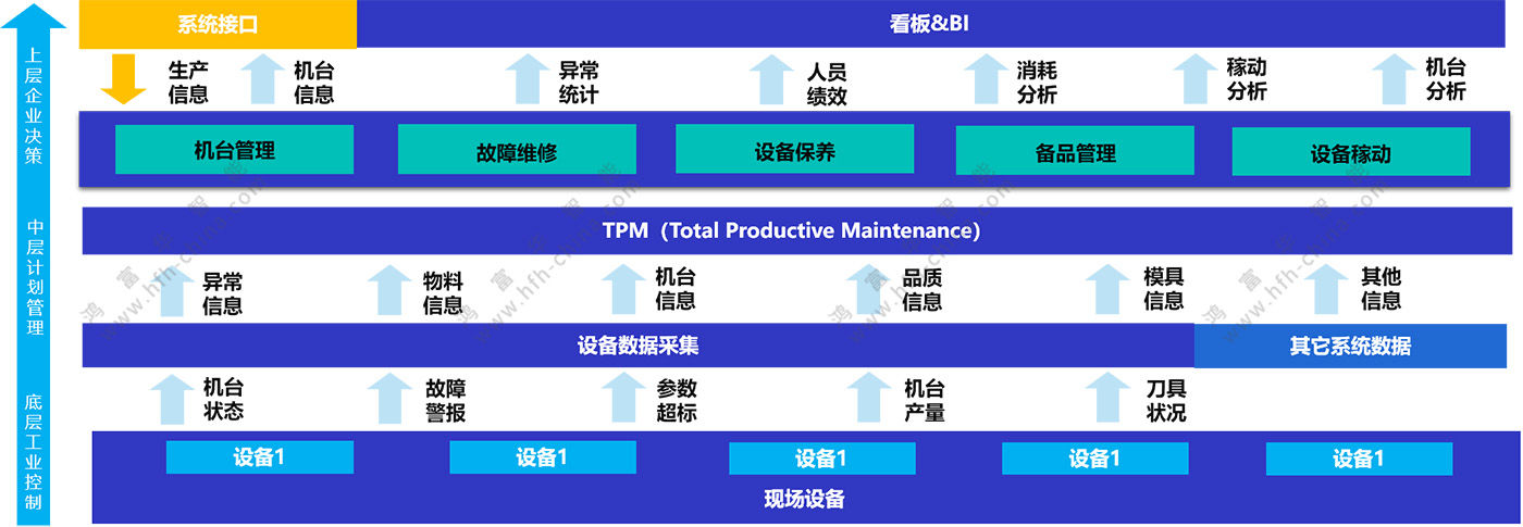 在中層“生產管理上”,根據不同維度(機臺信息、生產信息、物料信息、質量信息、模具信息)為TPM對應的機臺管理、故障維修、預防保養(yǎng)、備品管理及設備稼動提供依據。