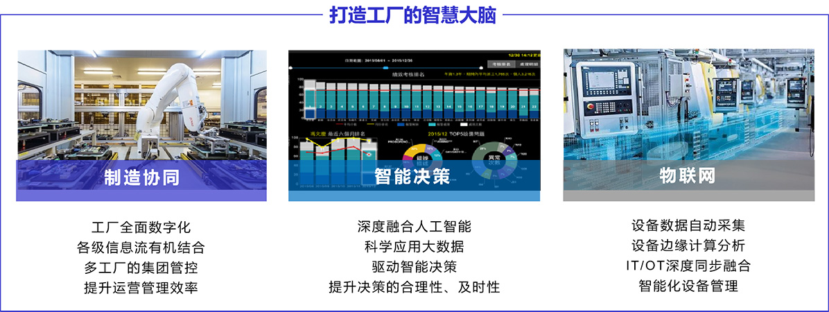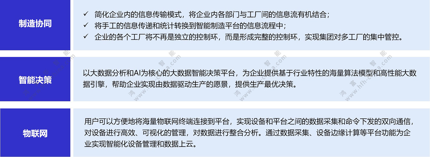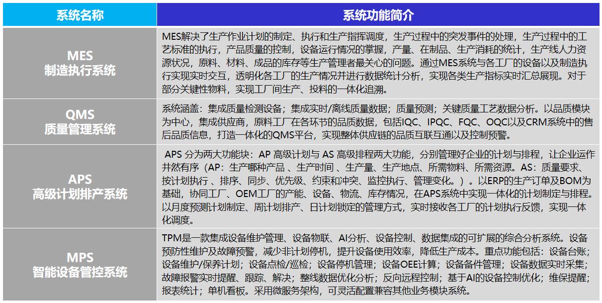 智能制造運(yùn)營管理平臺,主要包含制造協(xié)同、智能決策、物聯(lián)網(wǎng)三個(gè)子平臺。需要實(shí)現(xiàn)計(jì)劃協(xié)同、生產(chǎn)協(xié)同、品質(zhì)協(xié)同、庫存協(xié)同及生產(chǎn)透明化、物流一體化、管理移動化、決策數(shù)據(jù)化。信息化建設(shè)的主要模塊:制造計(jì)劃整體排產(chǎn)、供應(yīng)鏈需求整體拉動、廠內(nèi)物流智能拉動、MES與自動化對接、QMS品質(zhì)分析平臺建設(shè)、訂單跟蹤全流程透明、移動APP建設(shè)等。